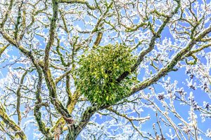 Die Mistel wurde seit Urzeiten als heilige Pflanze verehrt. Nach keltischer Überlieferung schnitt man sie am sechsten Tag nach Neumond in der Vorweihnachtszeit – ein Ritual, das nur mit goldener Sichel vollzogen werden durfte. Sie galt als Glücksbringer und als Schutz vor Giften. Ihr immergrünes Laub mitten im Winter zeigte den Sieg des Lebens über den Tod. Beim Trocknen verfärbt es sich golden – Sinnbild für das wiederkehrende Sonnenlicht.